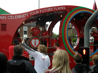 You might remember me telling you that Raymond was being honoured by Penny Green, one of the people chosen to carry the Olympic torch. She ran her stretch of the relay Monday morning in Dunstable, England. Here are a few pictures from the event.